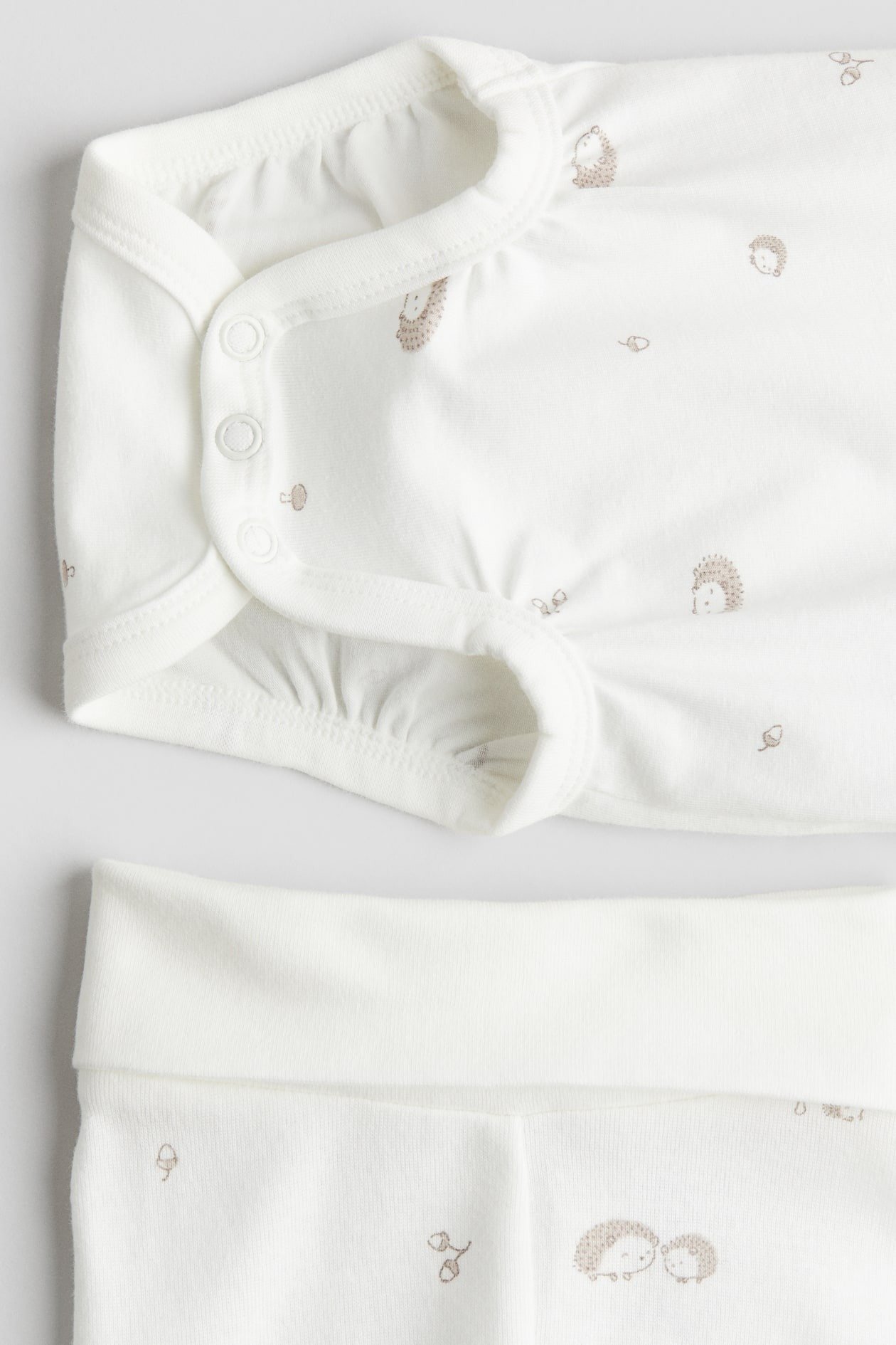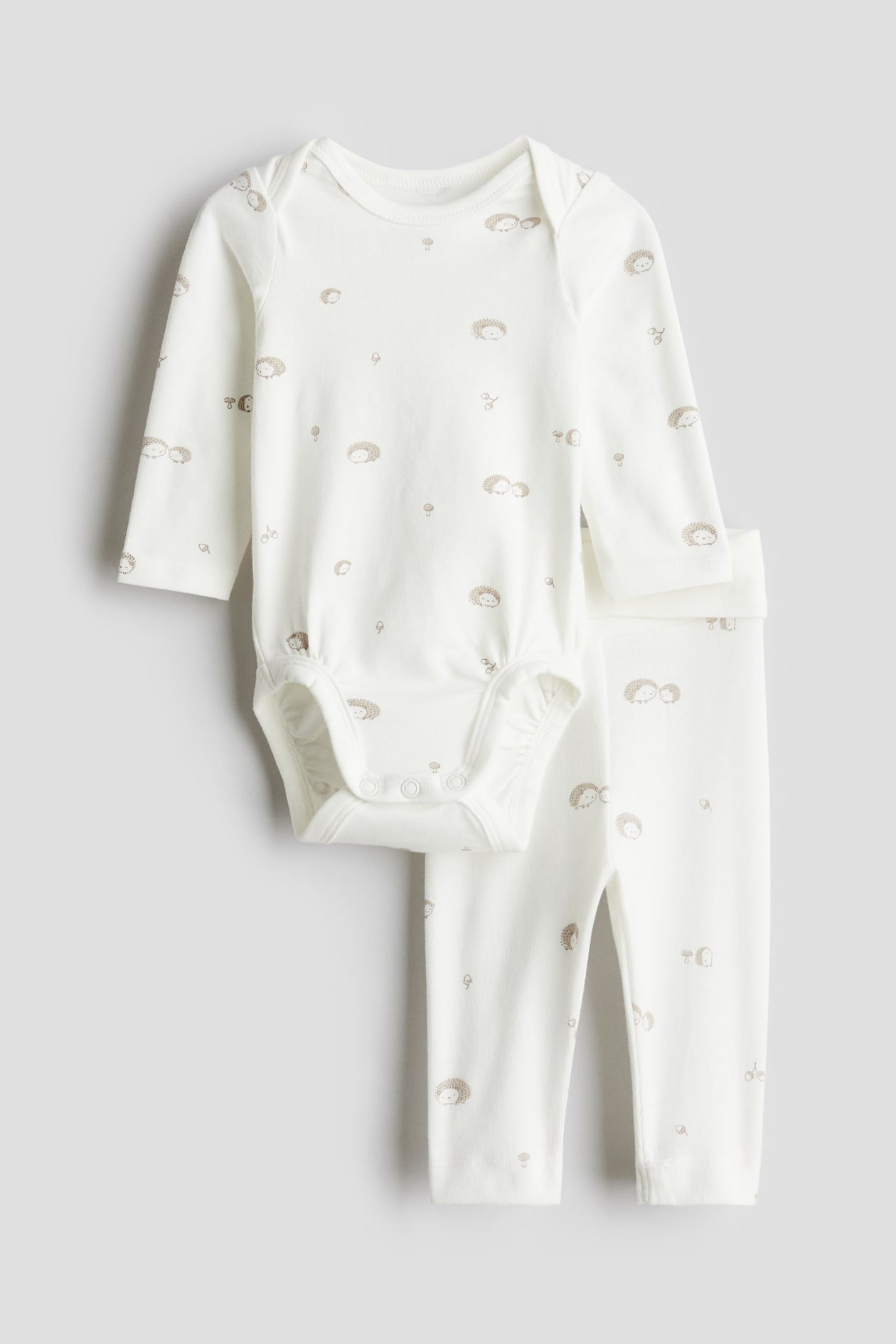 Set with a bodysuit and pair of leggings in supersoft cotton jersey. Long-sleeved bodysuit with lapped shoulders, press-studs at the crotch and gathered seams around the legs for a more comfortable and snug fit around the nappy. Leggings with a ribbed fold-over waist for a comfortable fit over the tummy.