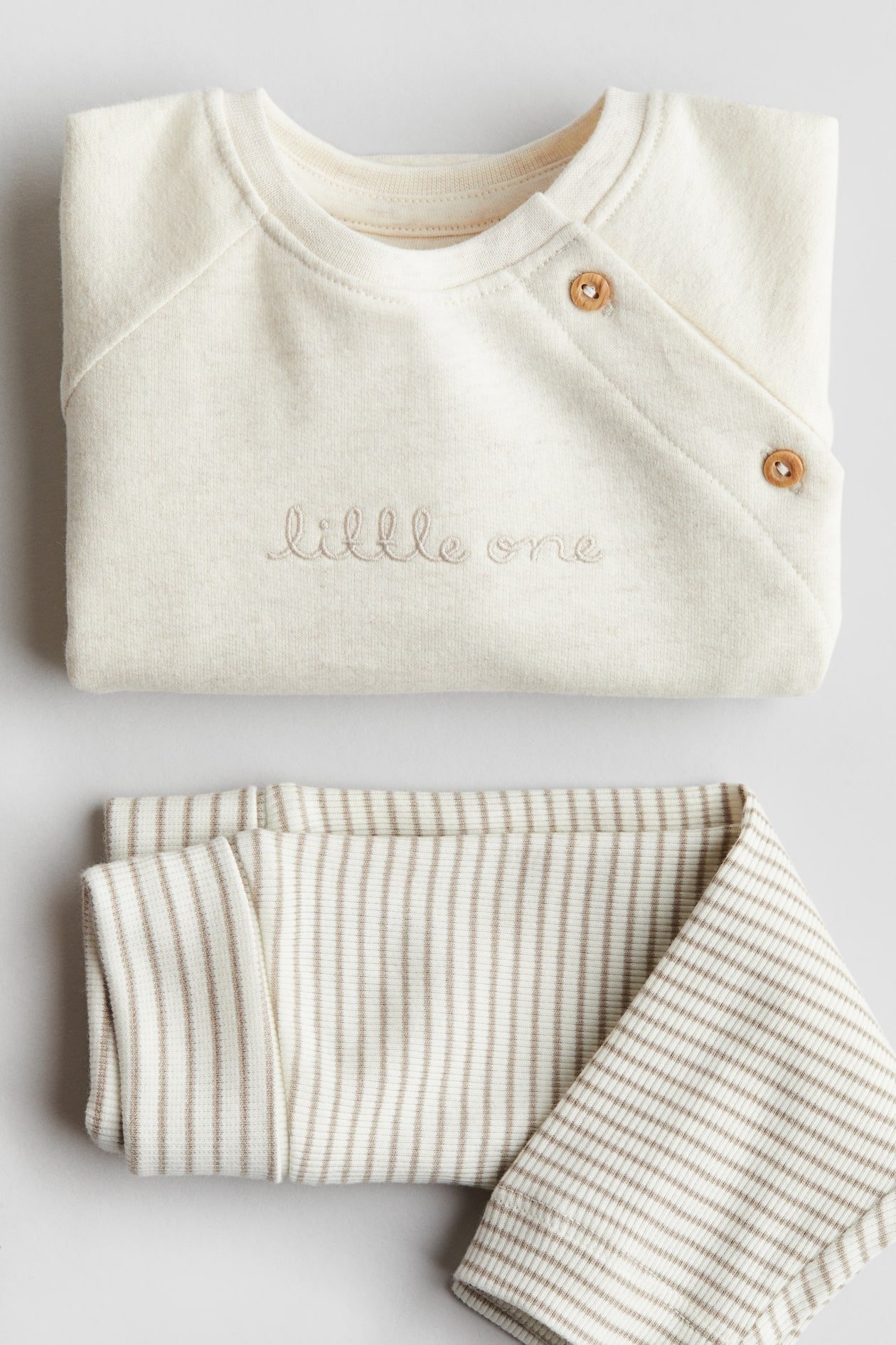 Set with a top and a pair of leggings in supersoft cotton. Top in lightweight sweatshirt fabric with buttons down one side for easy changing and long raglan sleeves. Leggings in ribbed jersey with an extra-wide waistband that can be unfolded as your child grows.