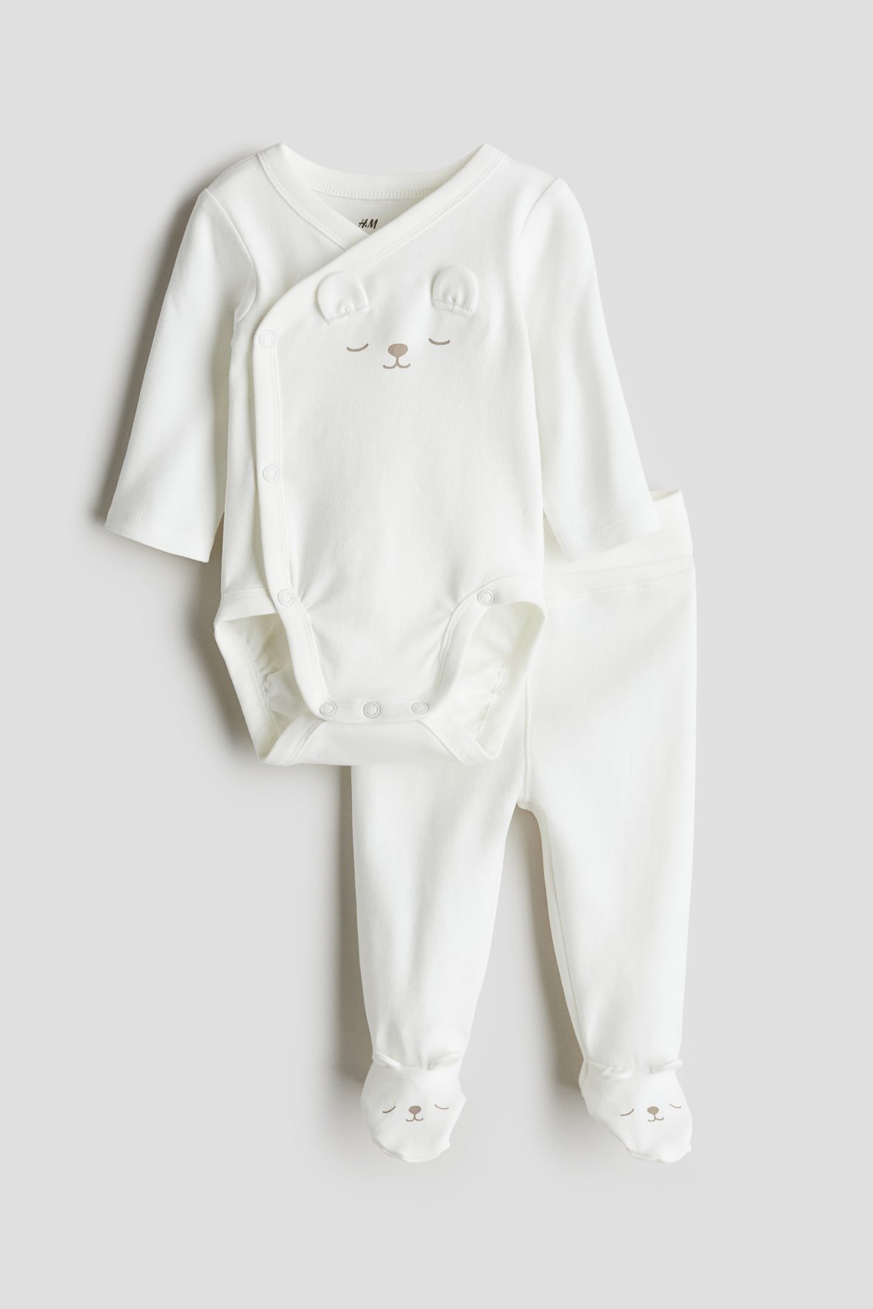 Set in supersoft cotton jersey with a long-sleeved bodysuit and pair of leggings. The bodysuit has a wrapover front with press-studs down one side and at the crotch for easy changing. Gathered seams around the legs for a more comfortable and snug fit around the nappy. Leggings with an extra-wide waistband that can be unfolded as your child grows and full feet with elasticated heels.