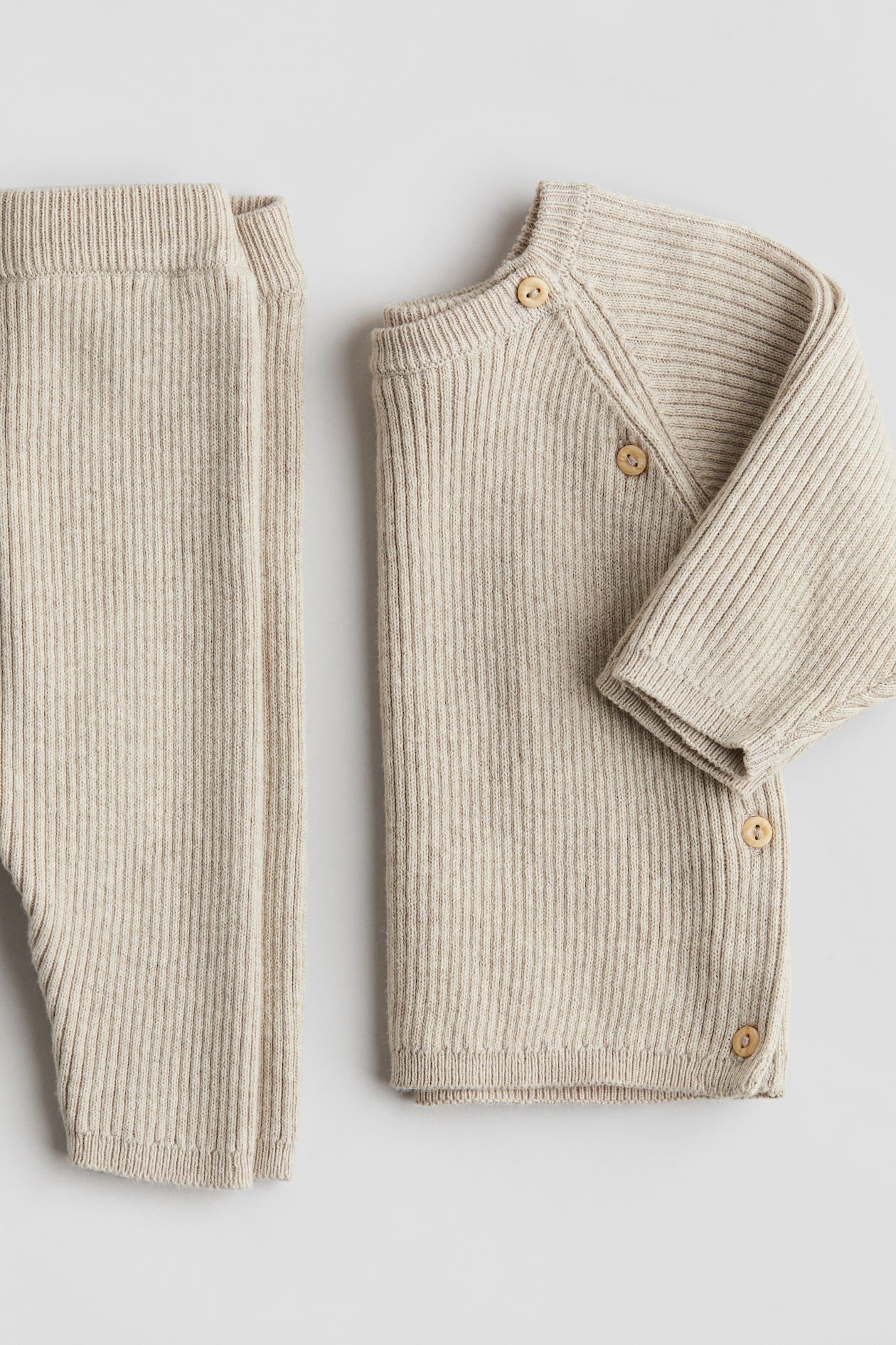 Set with a jumper in a textured knit and a pair of trousers in a soft cotton knit. Round-necked jumper with long raglan sleeves, buttons on one shoulder and down one side, and ribbing around the neckline, cuffs and hem. Trousers with elasticated ribbing at the waist and ribbed hems.