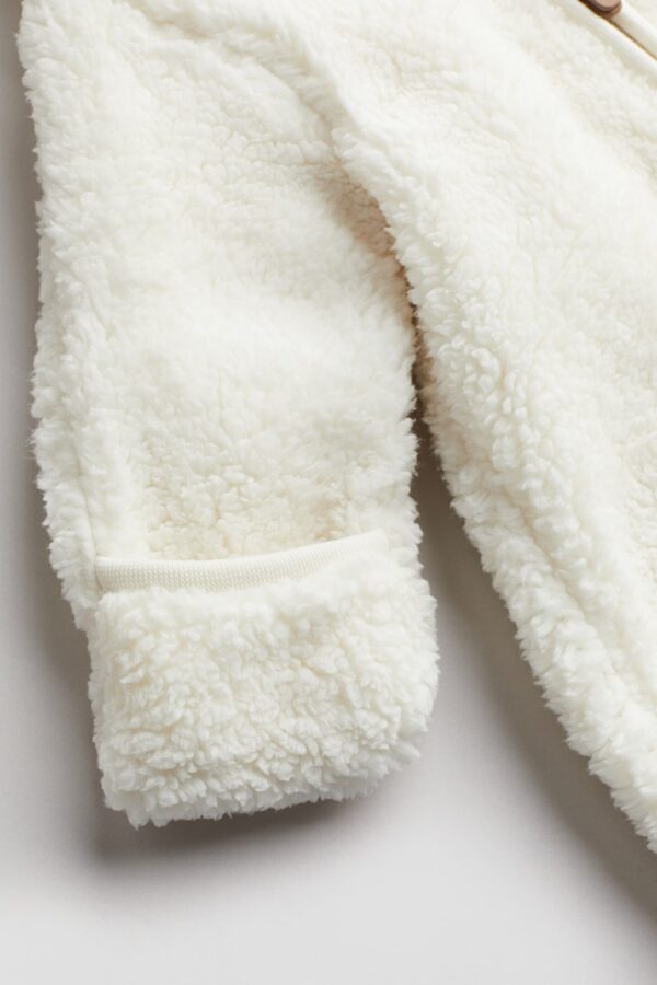 All-in-one suit in soft pile featuring a hood with ear-appliqués. Zip down the front with an anti-chafe chin guard. Foldover cuffs to keep the hands warm and full feet. Jersey lining.