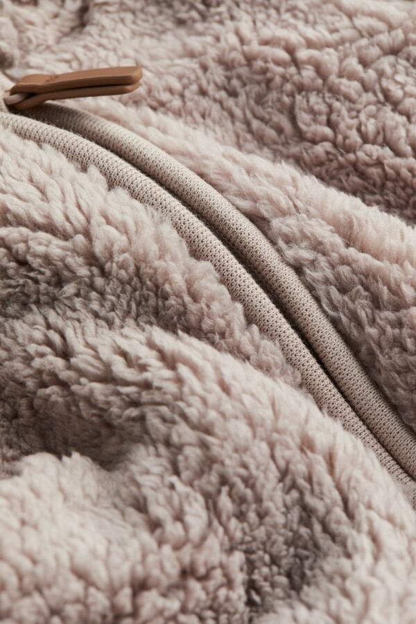 Pram suit in soft pile featuring a hood with ear appliqués. Zip down the front with an anti-chafe chin guard. Foldover cuffs to keep the hands warm and full feet. Jersey lining.