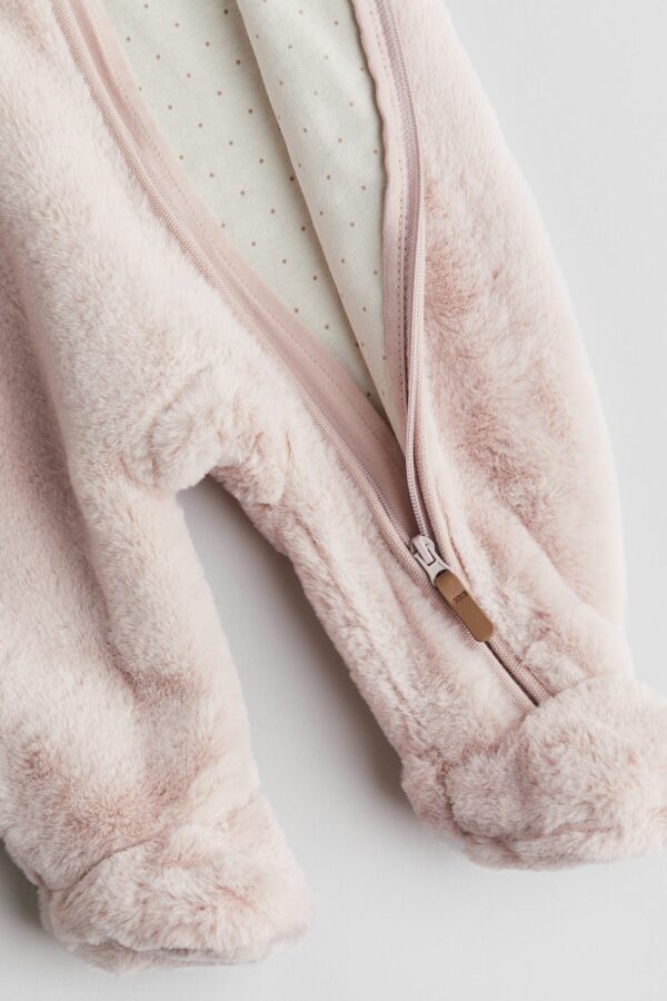 Pramsuit in soft, fluffy fabric with a hood featuring ear-appliqués. Zip down the front that continues down one leg and a chin guard. Foldover cuffs and full feet to keep the warmth. Soft jersey lining.