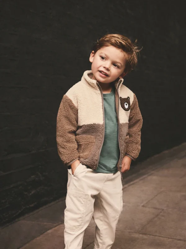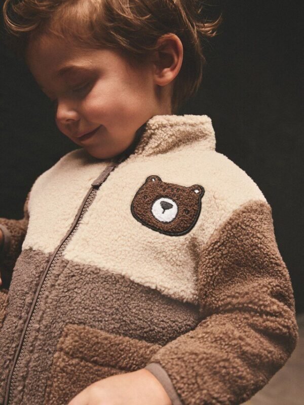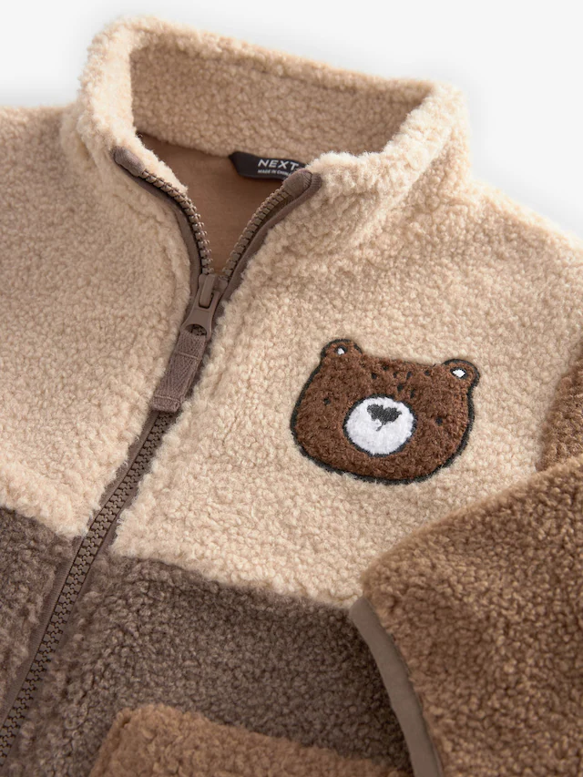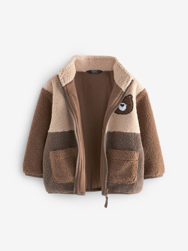Ideal as a mid or outer layer, this stylish brown fleece jacket has a colourblocked design with a full zip fastening, a borg fabric and a tall collar, finished with patch hand pockets and chenille bear branding.